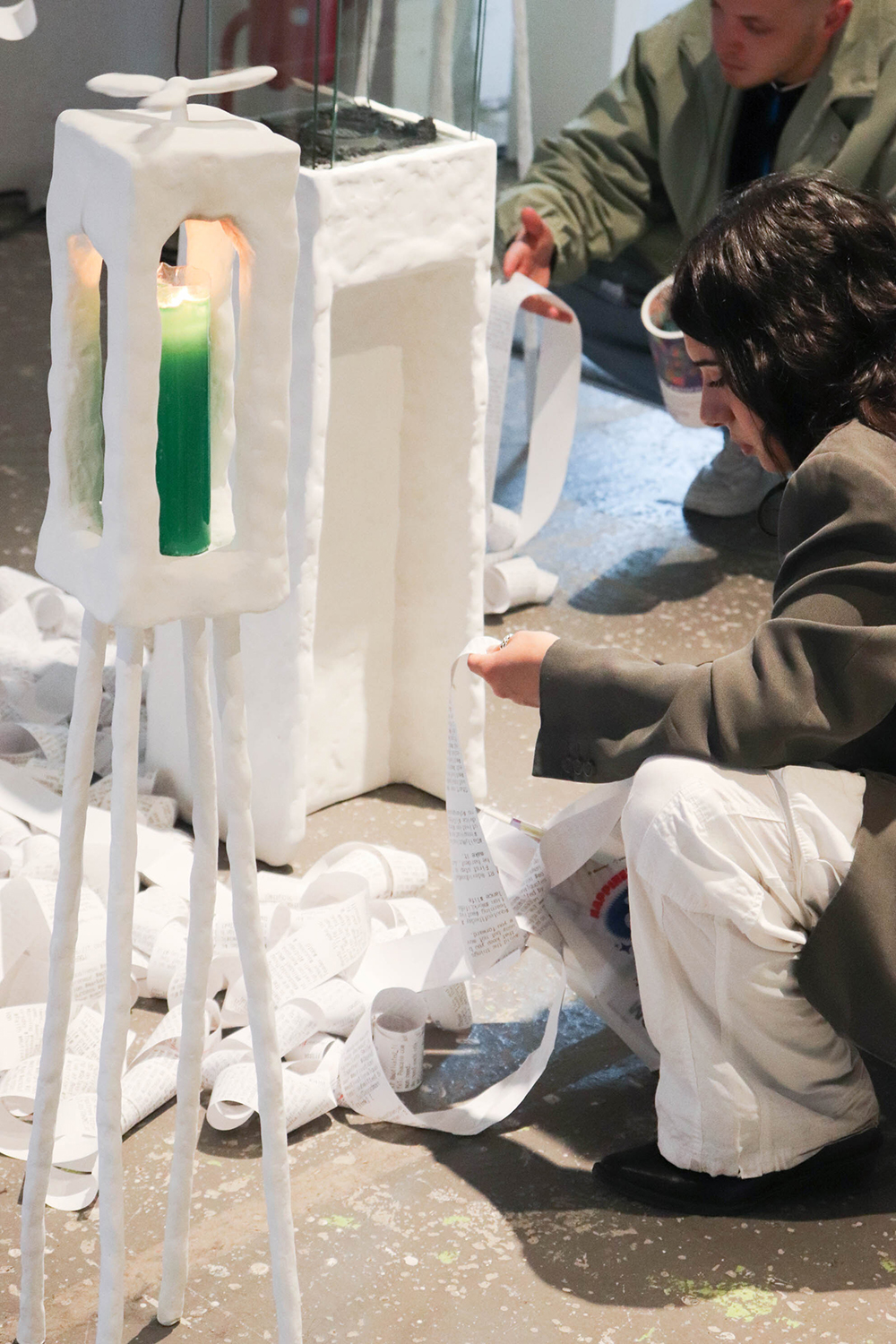 ‘Where positivity is plugged in’은 우리 주변에 널리 퍼져있는 긍정이 일으키는 폭력성이 우리 스스로가 긍정적 마음가짐 아래 자기착취하도록 만든다는 철학자 한병철의 아이디어를 빌려온 프로젝트이다. 소셜미디어나 자기계발 컨텐츠를 통해 전파되는 긍정적인 문구들은 무언가가 이루어 지기를 바라며 행하는 기도 의식을 연상시킨다. 따라서, 이 프로젝트는 긍정을 숭배해, 사람들의 긍정에너지를 물리적인 에너지로 전환시키는 의식을 위한 오브젝트들을 포함한다. 실시간으로 트위터 해시태그(#motivation)를 통해 전파되는 동기부여 글들이 프린터기에서 출력되고, 출력된 내용은 불에의해 타 프린터기를 작동시키는 데에 필요한 전기에너지가 된다. 나는 기도와 응답의 매커니즘을 긍정성이 생산성이 되고, 생산성은 다시 긍정성을 필요로 하게 되는 상황에 적용한다. 긍정을 통해 발전된 에너지의 순환을 통해, 이 프로젝트는 우리가 얻은 긍정적인 마음이 어떻게 어디로 향하는지에 대한 물음을 던진다.